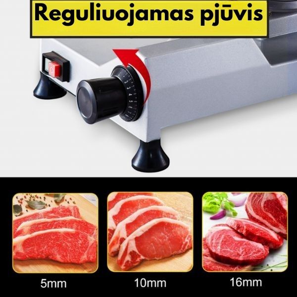kainoje yra įtrauktas reguliuojamas mygtukas, kuris leidžia pasirinkti idealų storį mėsai arba bet kuriam kitam produktui, kurį norite pjaustyti ar ruošti.