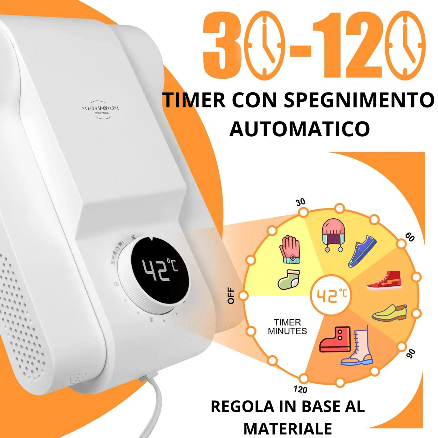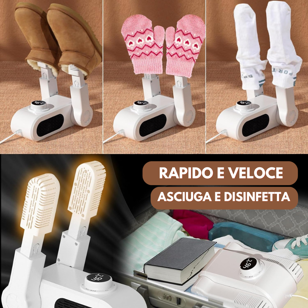 Questo asciugatore è dotato di 4 funzioni principali: asciuga, riscalda, rimuove l’umidità e il sudore e disinfetta le scarpe in soli 5 minuti, lasciandole calde per ore anche all'aperto. Grazie al suo riscaldamento uniforme a 360°, assicura che le tue calzature siano sempre asciutte e igienicamente pulite e prive di odori.