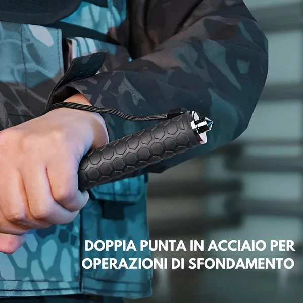 Integrata nel retro dell’impugnatura c’è una doppia punta in acciaio temprato, progettata per frantumare. Perfetta in situazioni d’emergenza o in caso di evacuazione: rompe vetri, lamiera sottile e ostacoli improvvisi. Non è solo un’arma da difesa, ma anche uno strumento da soccorso e sopravvivenza. Può fare la differenza in un incidente stradale, in un edificio in fiamme o in un contesto di fuga A differenza di altri bastoni, è dotato di vera funzionalità tattica per scenari reali Pensato per chi vuole essere sempre un passo avanti, anche quando tutto sembra fuori controllo. Un dettaglio invisibile ma potentissimo, che racchiude il concetto di “pronto a tutto”