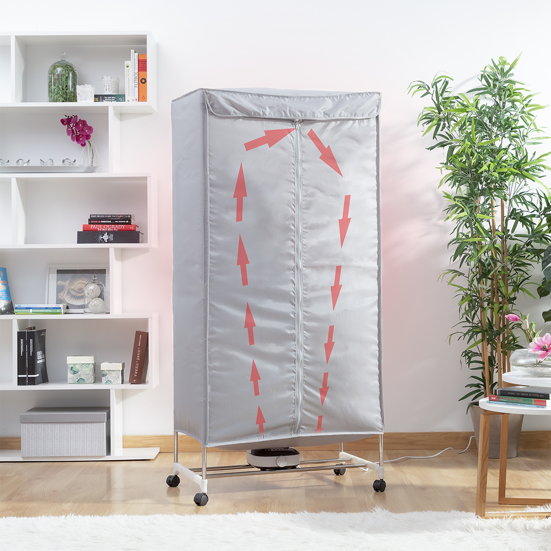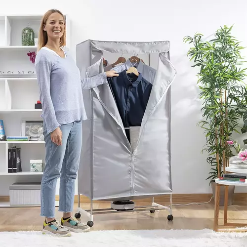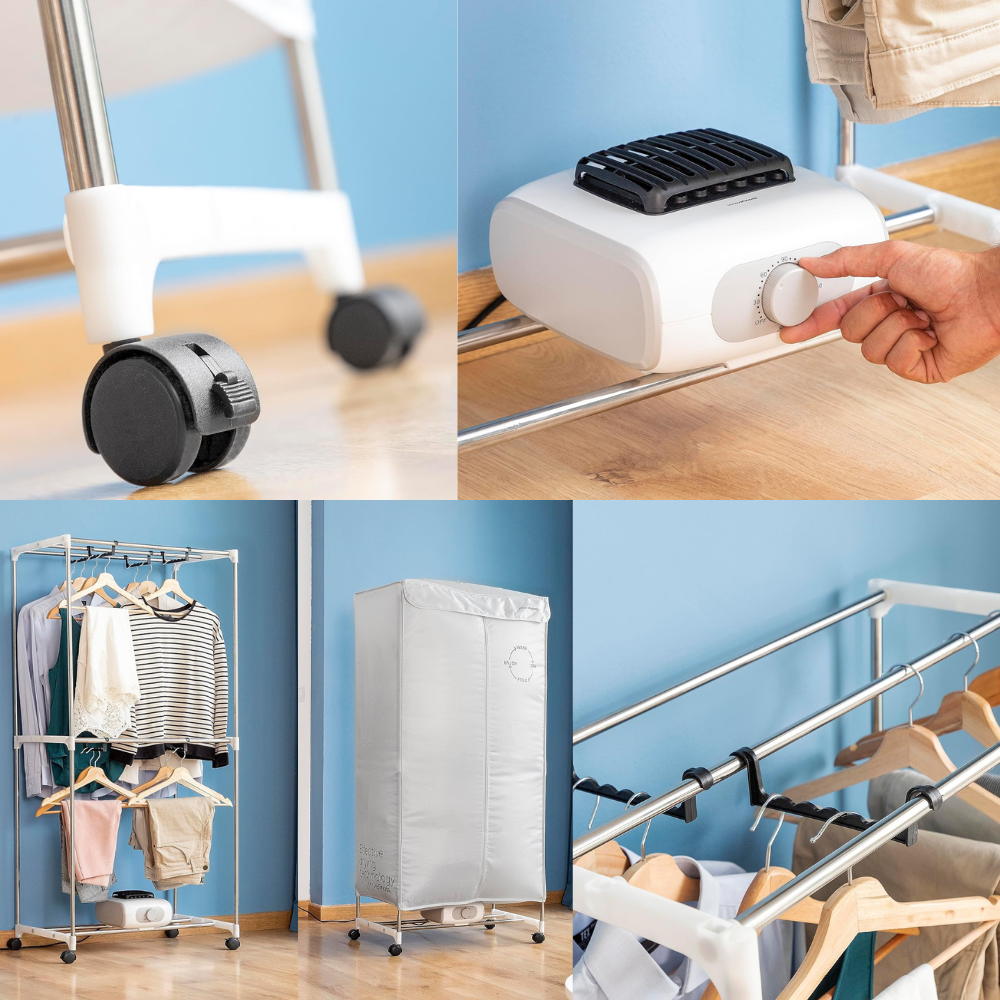 La nuova asciugatrice elettrica verticale semplifica il processo di asciugatura dei tuoi vestiti, risparmiando tempo e fatica. Il suo segreto è lo speciale sistema di asciugatura che emana aria calda fino a 70°, asciuga velocemente gli indumenti e li libera da batteri e odori sgradevoli. Il suo sistema verticale di asciugatura non stropiccia gli indumenti come l’asciugatrice e non ci sarà bisogno di stirarli. Acquistato dalle famiglie italiane per asciugare velocemente gli indumenti in casa, in cantina o in garage, risparmiando la fatica di stirare. Occupa pochissimo spazio ed è dotato di ruote con blocco di sicurezza .