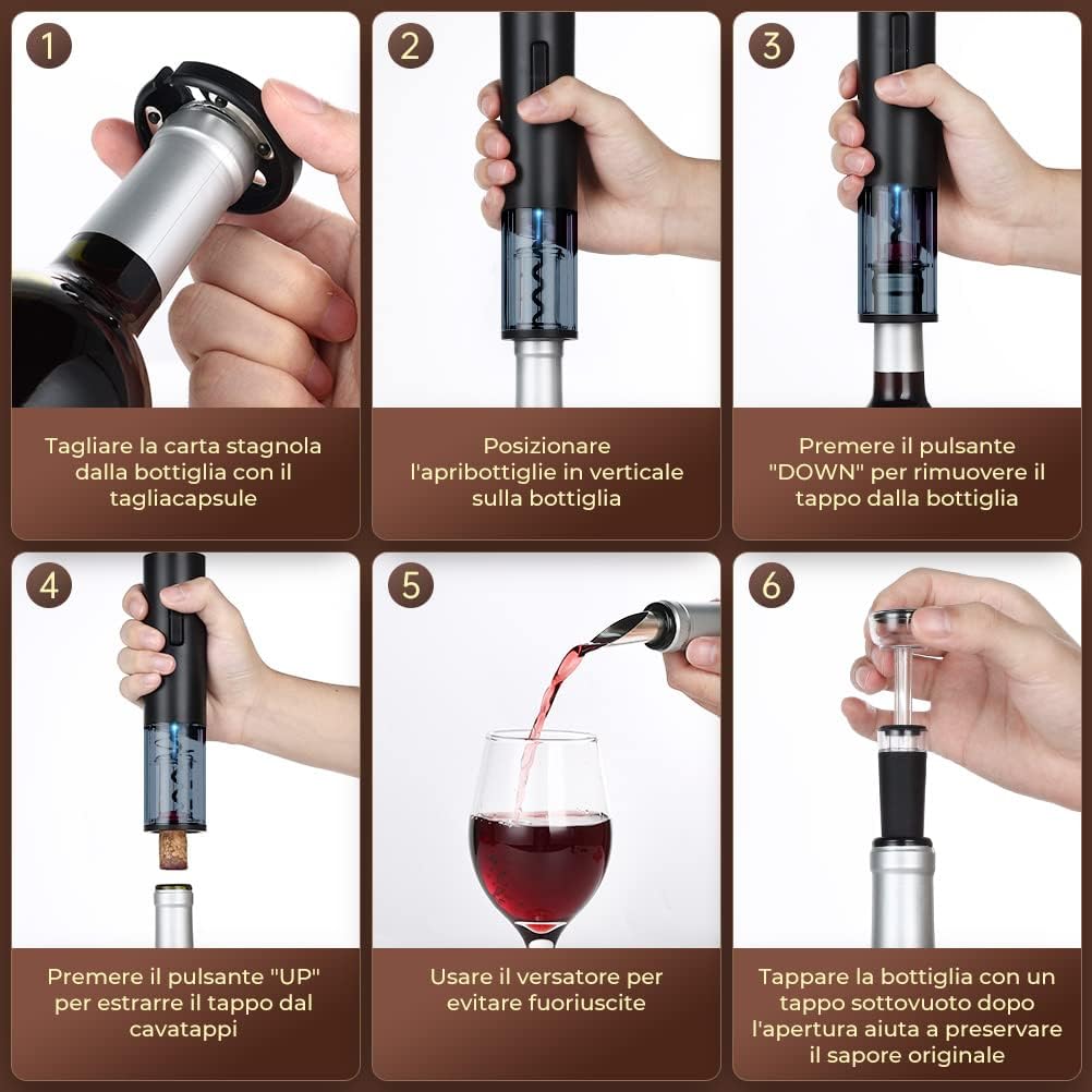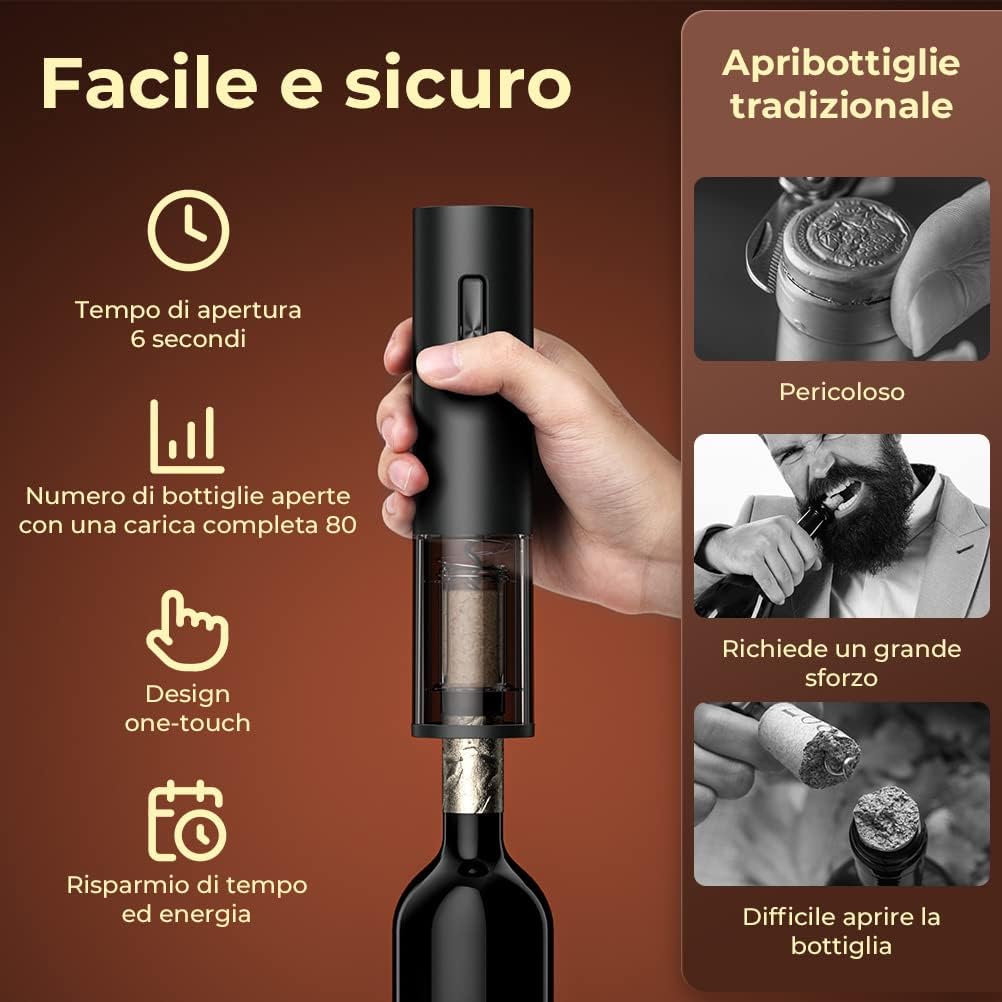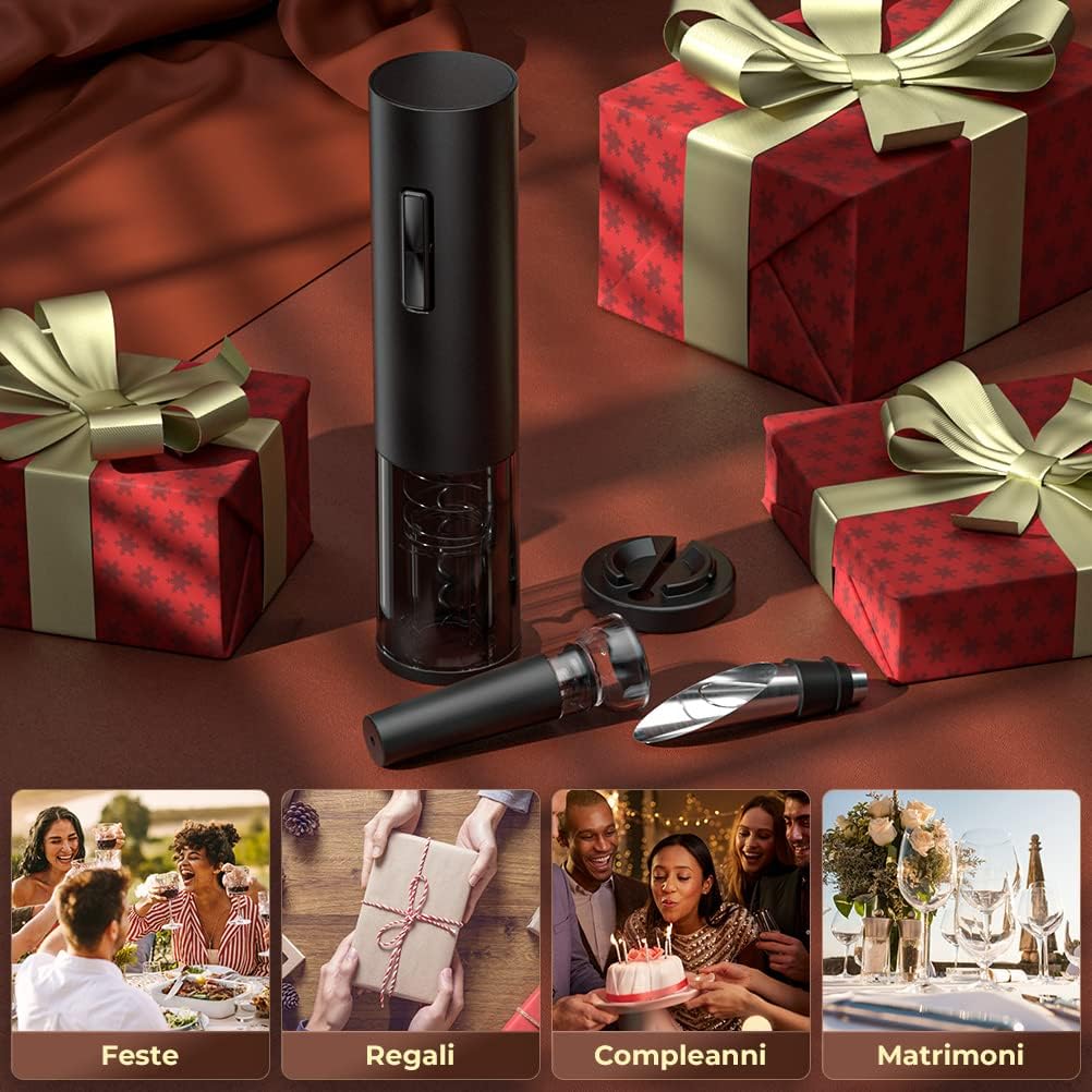 questo Cavatappi Elettrico sarebbe un ottimo regalo per la vostra famiglia, gli anziani, gli amici, i vicini. Non c'è bisogno di preoccuparsi della difficile apertura del tappo, il potente sistema di alimentazione dell'cavatappi vi aiuta ad aprirlo rapidamente e senza danneggiare il tappo.