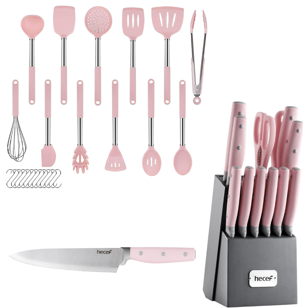 Il set da cucina da 19 pezzi include: 5 coltelli da cucina super resistenti. Utensili da cucina in nylon incluse pinze, forchetta per la pasta, cucchiaio scanalato, spatola, mestolo, frusta, 1 paio di forbici e sbucciatore, 1 tagliere, affilacoltelli e 2 coltelli per affilare, e altri utensili di stoccaggio.