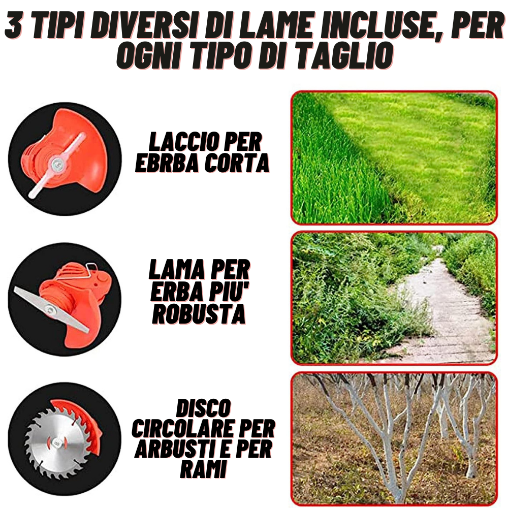 Potente e leggero a batteria utilizzabile in ogni angolo del giardino per tagliare erba, erbacce e anche cespugli.Le sue 3 lame differenti permettono di tagliare qualsiasi tipo di erba e arbusto, da quella più morbida a quella più fitta.