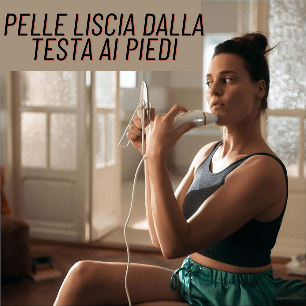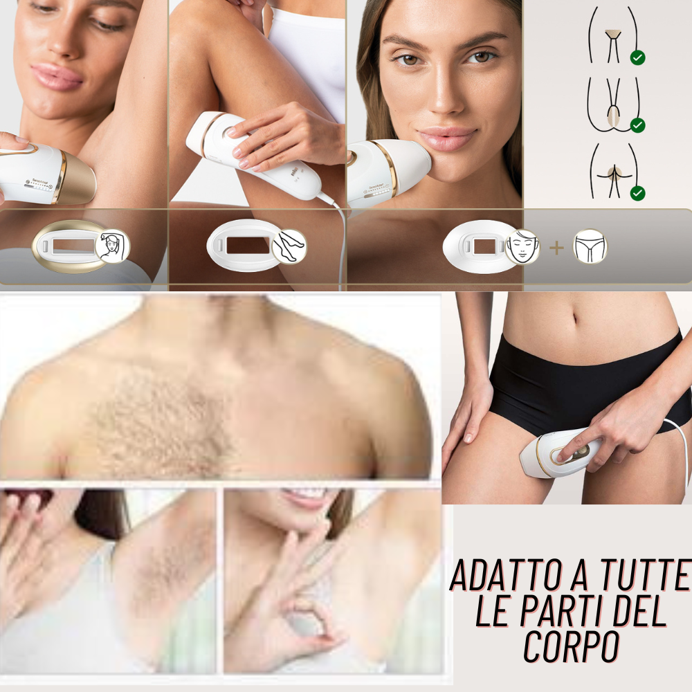 Epilatore Luce Pulsata per sessioni dalla testa ai piedi: tratta gambe, braccia, petto, schiena, viso, ascelle e persino la zona bikini con testine dedicate