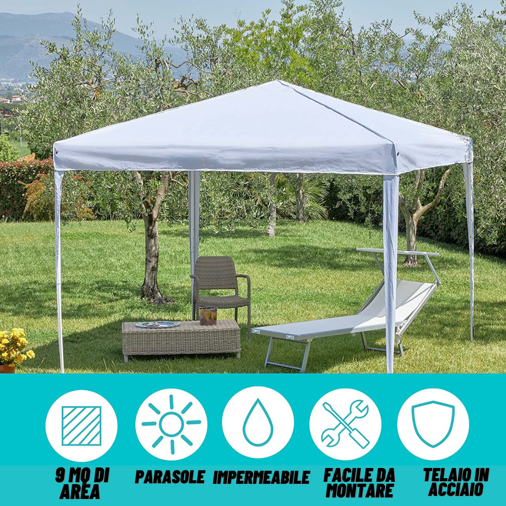 Un Gazebo economico ma di qualità. La soluzione pratica e funzionale per i tuoi esterni per rilassarti al fresco e rendere elegante il tuo giardino o qualsiasi ambiente.Il primo Gazebo pieghevole che si monta e smonta in 5 minuti, con copertura idrorepellente