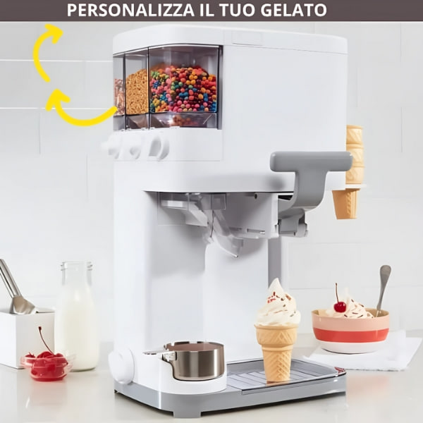 🎨 Aggiungi smarties, cioccolato, cereali e molto altro! 🍪 Rendi ogni porzione diversa dalla precedente con i 3 scomparti integrati dedicati ai topping. Puoi decidere al momento se aggiungere cioccolato fondente, granella di nocciole, frutti rossi, biscotti sbriciolati o qualsiasi altra golosità. Ogni porzione diventa un’opera d’arte: non solo bella da vedere, ma anche irresistibile da gustare.