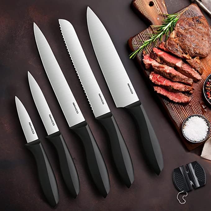 lama affilata come un rasoio, manici comodi e controllo bilanciato, facile da pulire e lavabile in lavastoviglie, e lame seghettate trasversali e longitudinali dei coltelli da forno consentono di tagliare i dolci soffici in fette sottili senza romperli VI DIAMO 5 coltelli da cucina (1 pezzo x 8 pollici coltello da chef, 1 pezzo x 3 pollici spelucchino, 1 pezzo x 8 pollici coltello da pane, 1 pezzo x 8 pollici coltello a fette, 1 pezzo x 5 pollici coltello di utilità)