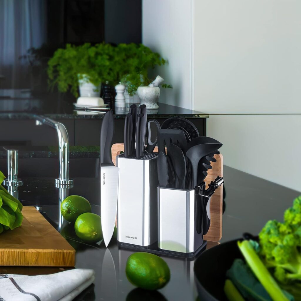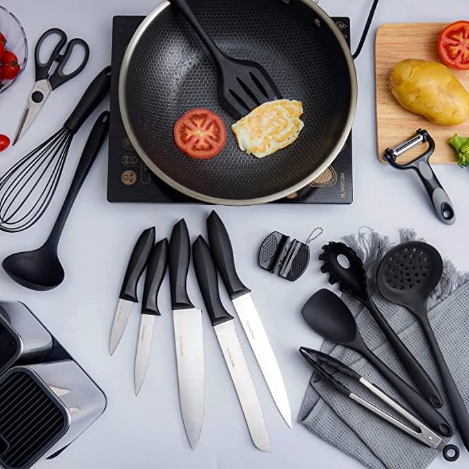 Il set da cucina da 19 pezzi include: 5 coltelli da cucina super resistenti. Utensili da cucina in nylon incluse pinze, forchetta per la pasta, cucchiaio scanalato, spatola, mestolo, frusta, 1 paio di forbici e sbucciatore, 1 tagliere, affilacoltelli e 2 coltelli per affilare, e altri utensili di stoccaggio.