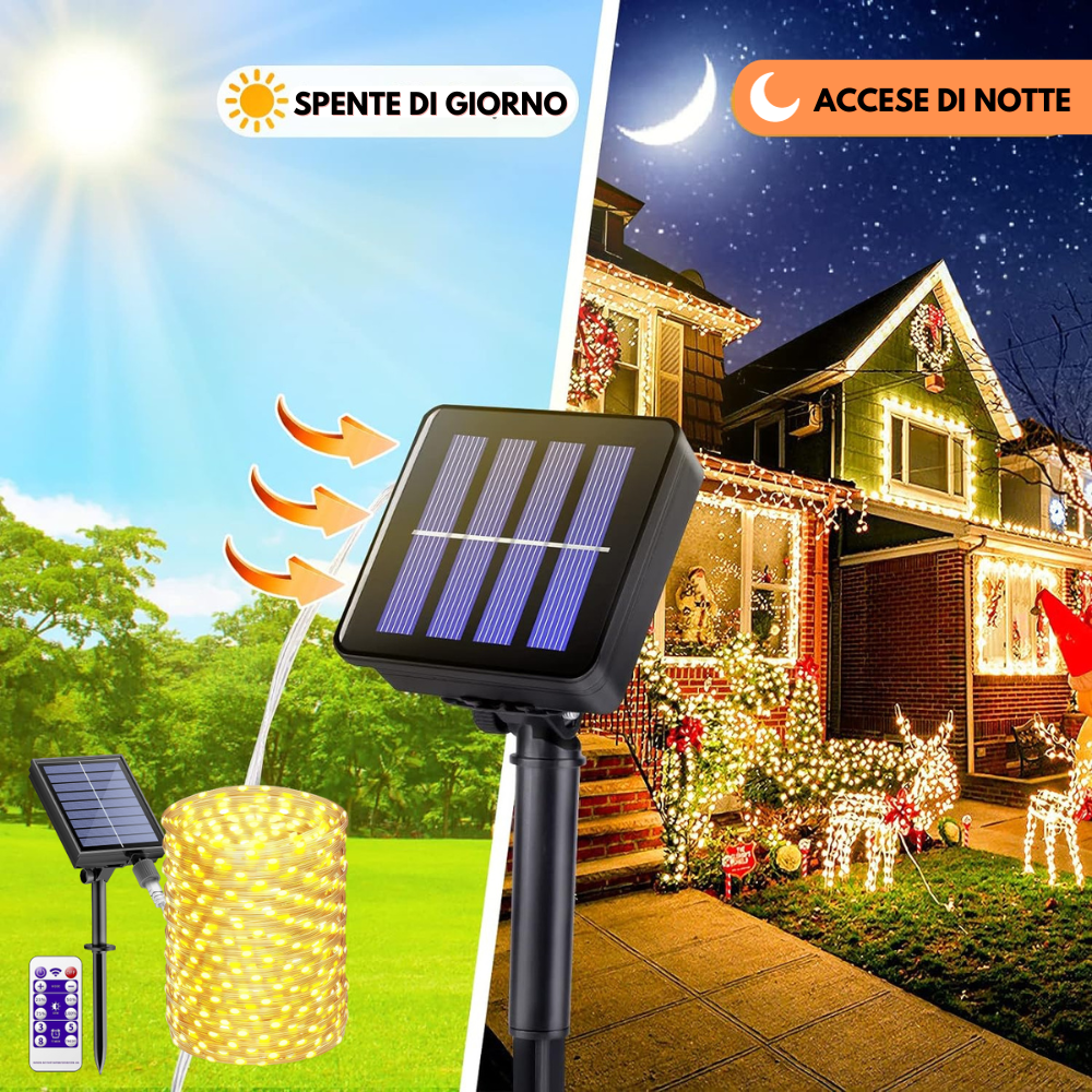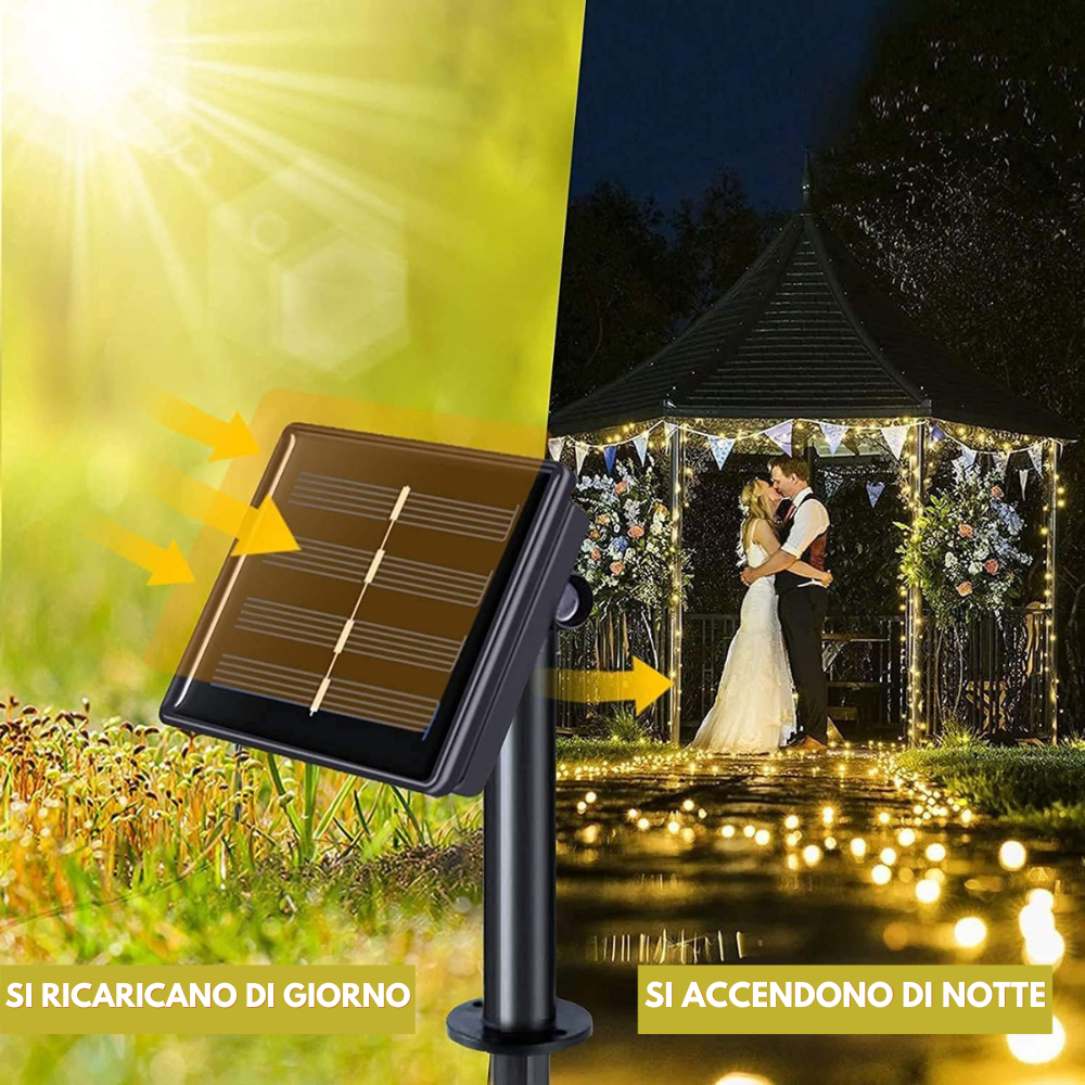 hai pensato di addobbare posti scomodi, come i cornicioni del tuo palazzo, oppure un gazebo, insomma posti dove non esiste l'elettricità, grazie alle nostre luci solari potrai illuminare qualsiasi cosa , non vanno in corrente si accendono al tramonto in modo automatico