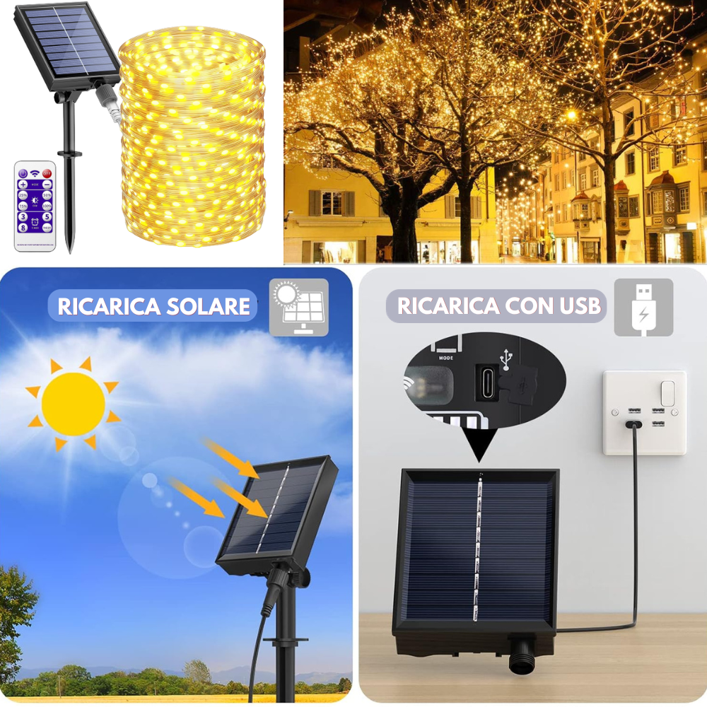 si tratta di luci ,con alimentazione solare , di giorno assorbono l'energia dal sole e al tramonto si accendono in automatico, qualora decidi di comandarle tu , puoi farlo tramite il telecomando in dotazione ,puoi anche ricaricarle con usb in dotazione per un utilizzo infinito di ore