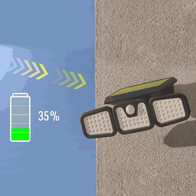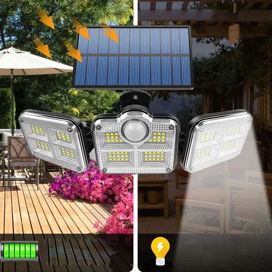 Questa lampada da parete ad energia solare è dotata di tre teste LED rotanti , che possono illuminare un’ampia area della tua casa. Con una potenza massima di 5000 Lumen, fornisce una luce super brillante, rendendola un’ottima luce notturna di sicurezza.È ideale per illuminare scale, vialetti, cortili, giardini, recinzioni, cortili, vialetti, garage e pareti esterne.