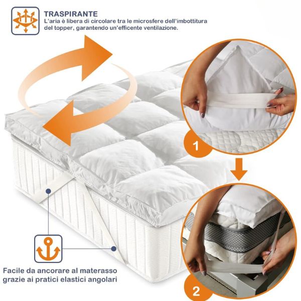 la struttura a canali favorisce la circolazione dell’aria che, grazie alle caratteristiche della piuma di termoregolazione, consentono di utilizzare il topper per tutto l’anno.