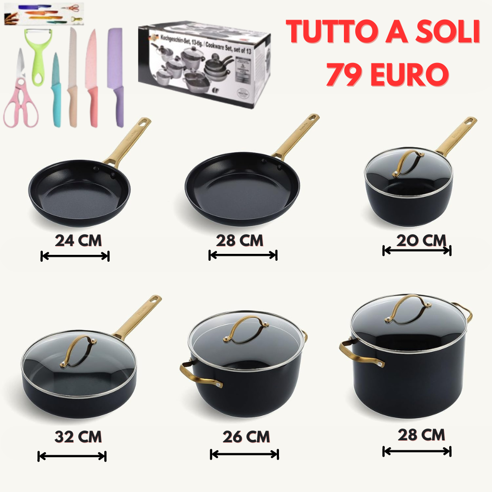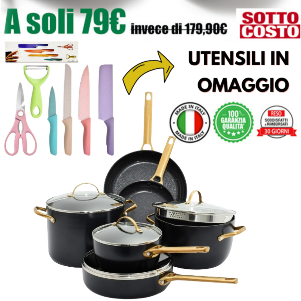 OLTRE , alle 12 pentole oggi ricevi in omaggio il nostro kit utensili in acciaio inox , coltelli che garantiscono un taglio preciso e sicuro di qualsiasi alimento, anche una forbice professionale è un pela ortaggi con lama inossidabile