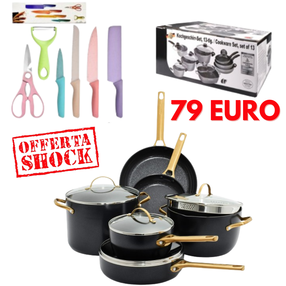 OLTRE , alle 12 pentole oggi ricevi in omaggio il nostro kit utensili in acciaio inox , coltelli che garantiscono un taglio preciso e sicuro di qualsiasi alimento, anche una forbice professionale è un pela ortaggi con lama inossidabile