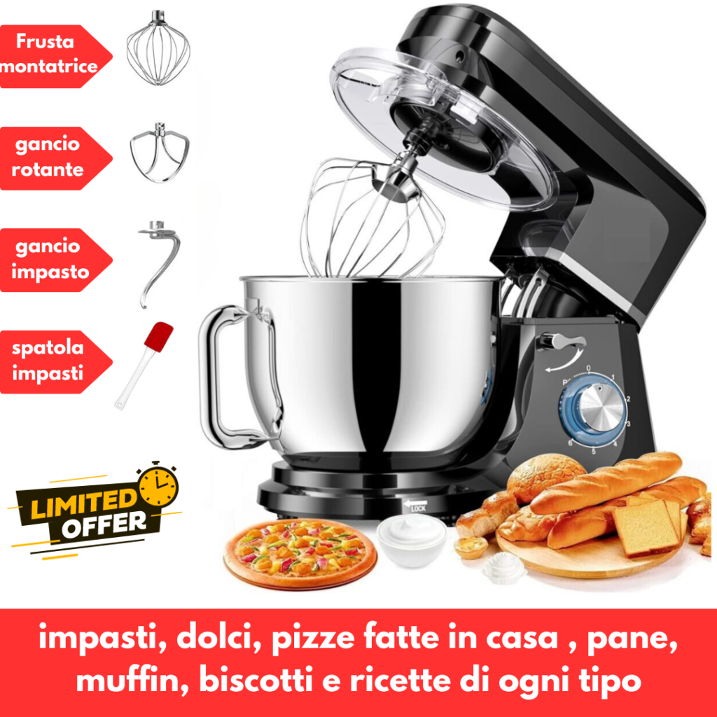 Ideale per impastare la pasta per pane, pizza, mescolare torte, pasta per biscotti, fondente, patate, frullare liquidi, salse, panna e creme pasticcere.