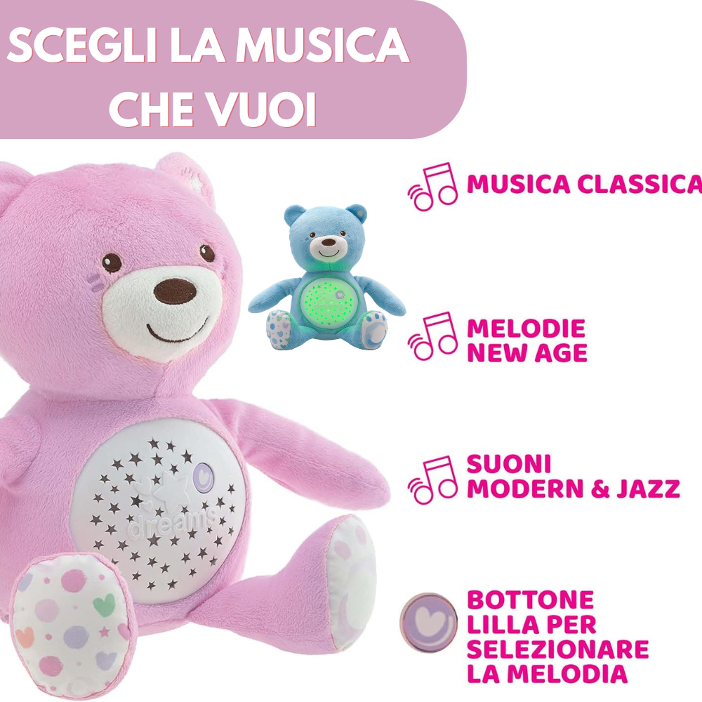 Il sistema a luci integrato proietta un fantastico cielo stellato sul soffitto, basta premere il pulsante sulla pancia e il sensore attiva una magnifica cascata stellare all’istante!