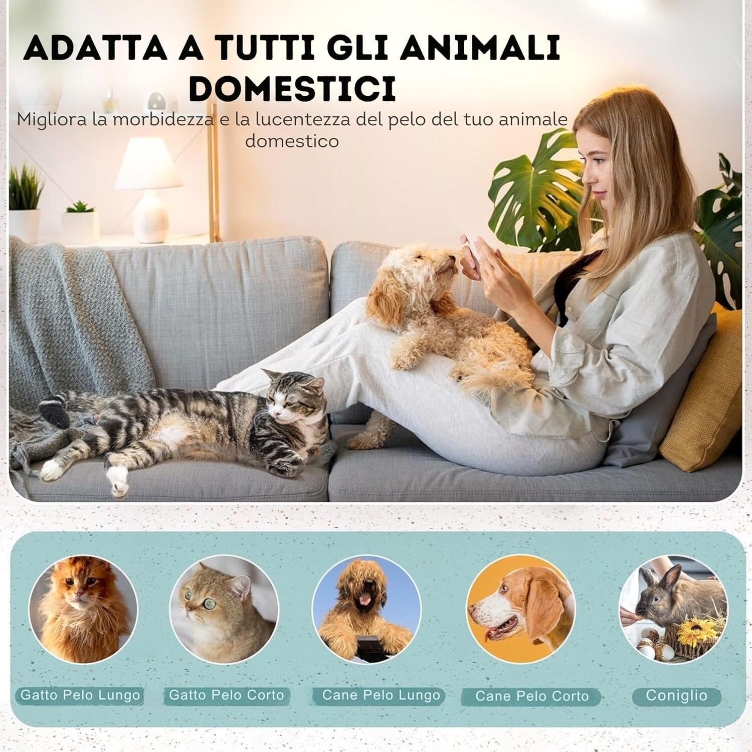 La nostra spazzola a vapore senza fili è studiata per funzionare perfettamente su qualsiasi tipo di pelo: lungo, corto o riccio. È ideale non solo per cani e gatti di tutte le razze, ma anche per conigli e altri piccoli animali domestici.