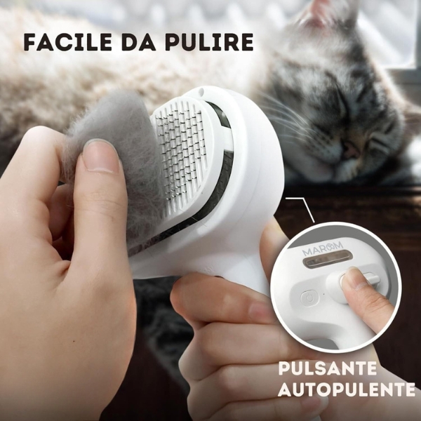 Grazie al pratico tasto autopulente, rimuovere i peli raccolti dalla spazzola è semplicissimo e immediato: con un solo clic, le setole si liberano automaticamente dai peli tagliati o persi, senza doverli raccogliere a mano. Questo sistema igienico e innovativo ti permette di mantenere la spazzola sempre pulita e pronta all’uso, rendendo la toelettatura più veloce, comoda e senza sprechi.
