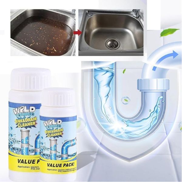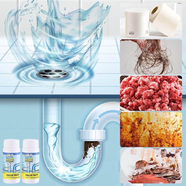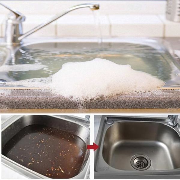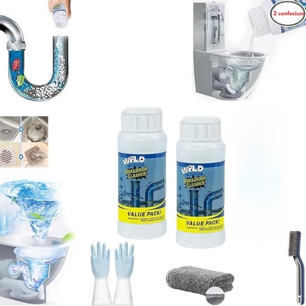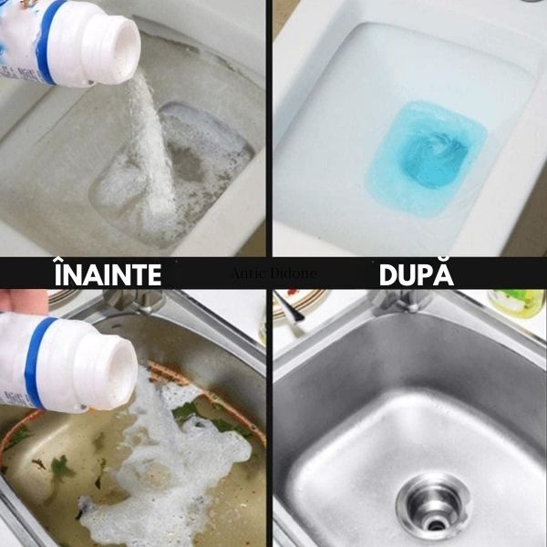 Pulberea specială tensioactivă reacționează la contactul cu apa transformându-se într-o spumă de curățare puternică care curăță temeinic și desfundă țevile.