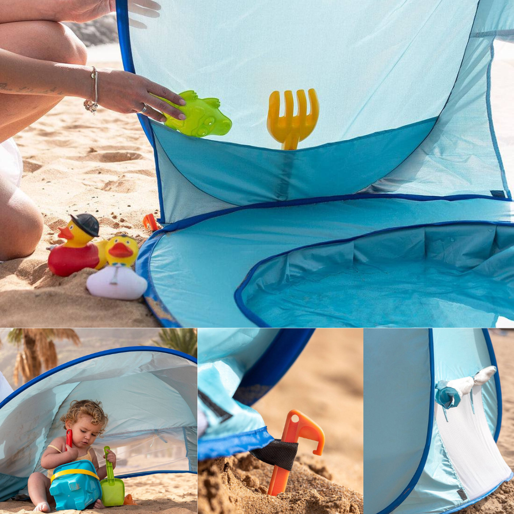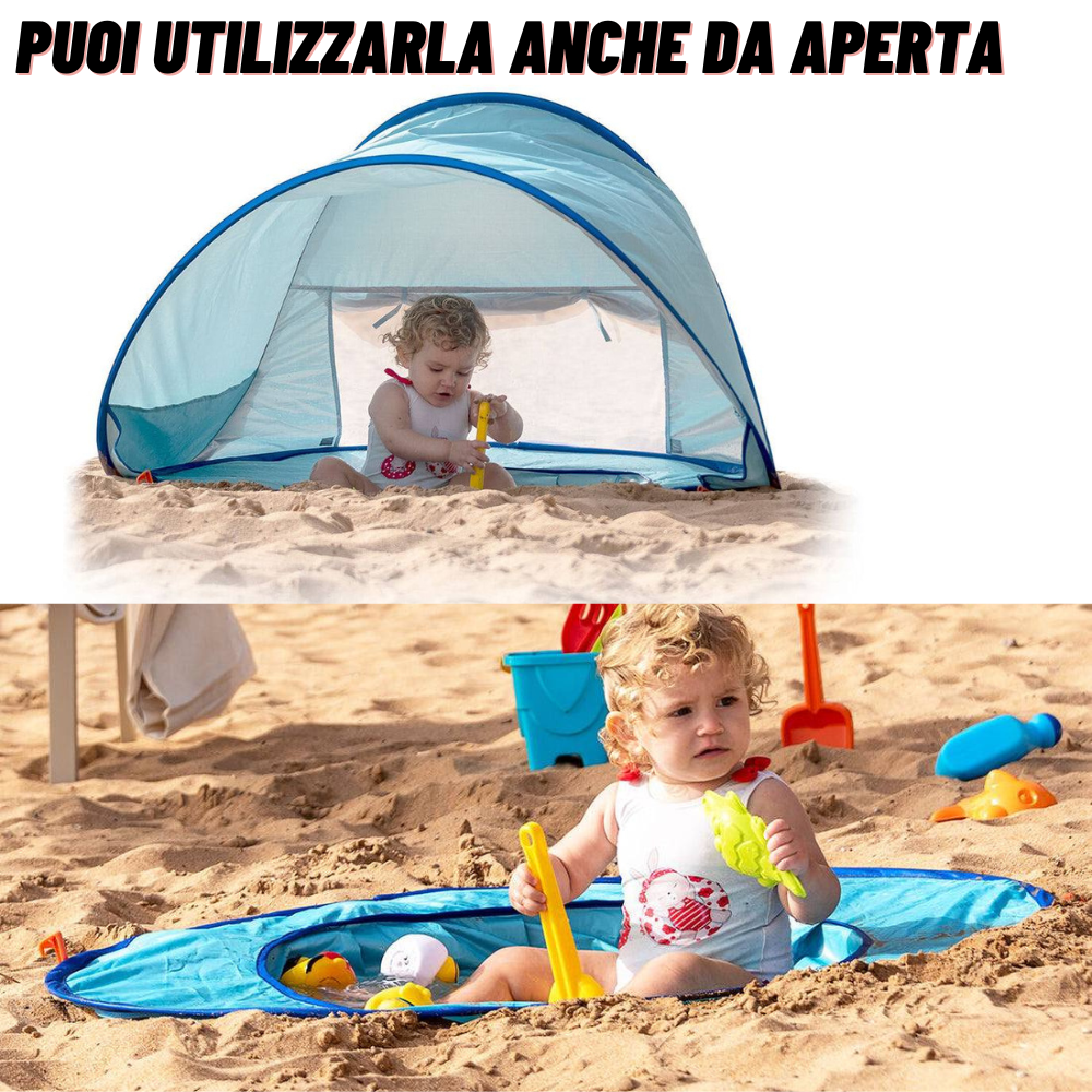 Questa tenda da spiaggia con piscina è perfetta per creare un’area di gioco sicura e protetta, dove i tuoi piccoli potranno godersi una bella giornata al mare, restando totalmente protetti dal sole. In più potranno rinfrescarsi nella mini-piscina inclusa alla base in cui i tuoi bimbi potranno immergersi e giocare .