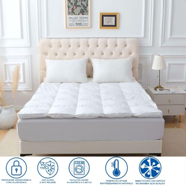 Goditi un sonno fresco e avvolgente con il nostro TOPPER IN PIUMA, realizzato in morbido materiale traspirante. Il rivestimento innovativo non solo offre una sensazione di lusso al tatto,