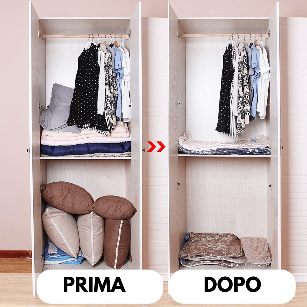 Questa pompa sottovuoto ti offre una soluzione semplice ed efficace per tenere alla larga muffa e polvere dai tuoi abiti e conservare al meglio i tuoi alimenti. Risparmia oltre l’80% dello spazio nel tuo armadio e dii addio agli sprechi alimentari che si fanno ogni giorno più enormi.