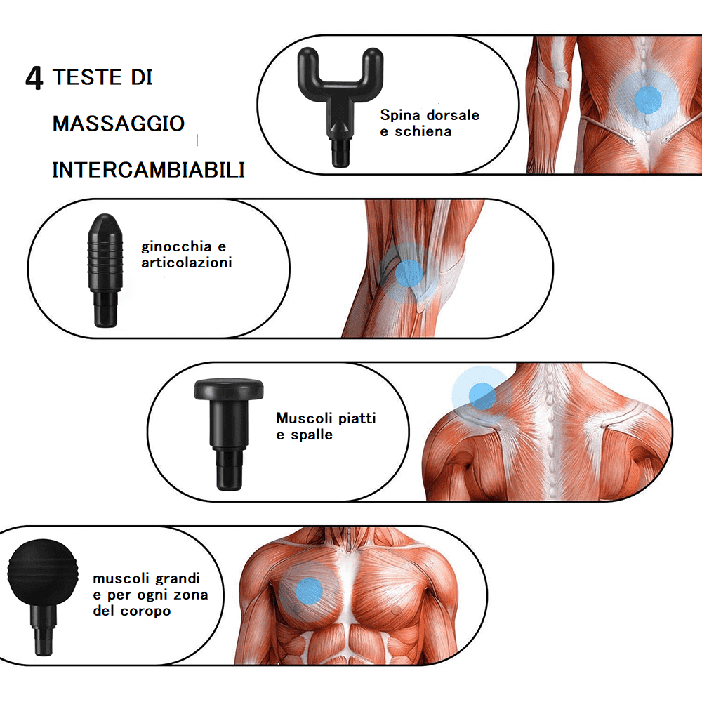 Grazie alle diverse vibrazioni impostabili e le diverse testine intercambiabili , simula le migliori mani al mondo in tema di massaggi muscolari ed articolari , donandoti sollievo , recupero muscolare rapido cancellando il dolore