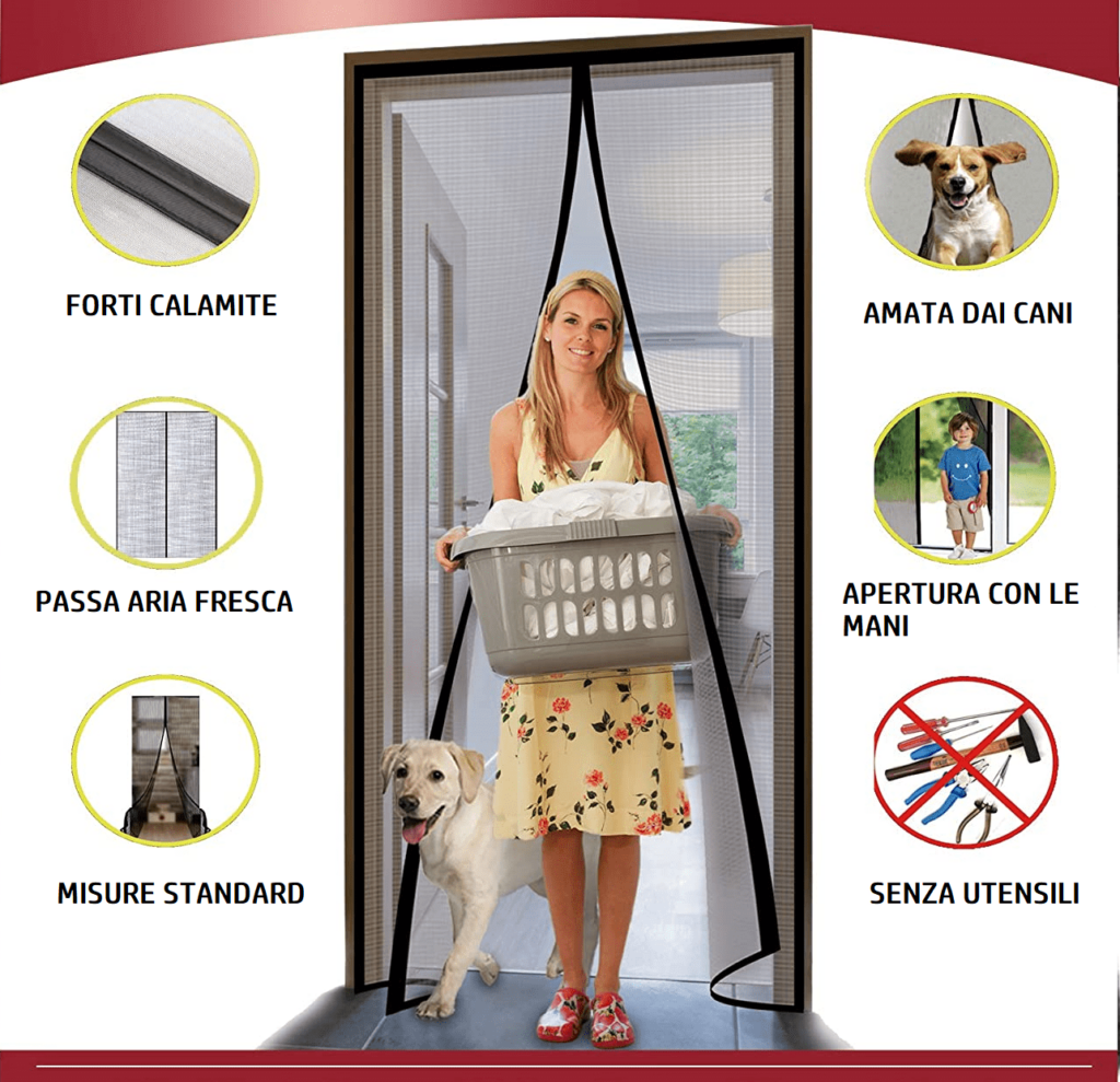 Queste zanzariere sono super resistenti e ti permetteranno di liberarti all’istante da tutti gli insetti fastidiosi che si presentano dentro casa ogni volta che apri le classiche zanzariere. Con questa tenda magnetica potrai sbarazzartene senza l’utilizzo di sostanze chimiche e tossiche per l’uomo e per gli animali.